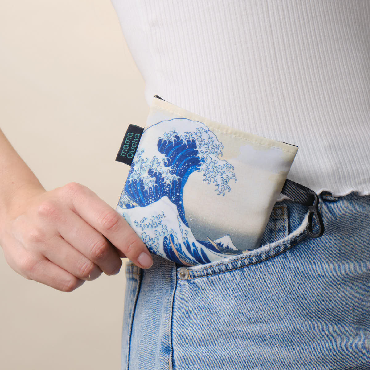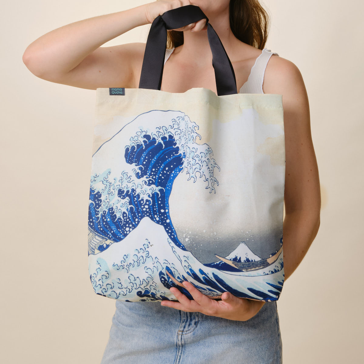 Bolsa de tela plegable: ¡práctica y liviana! Resiste hasta 14 kg de peso sin dañarse. El diseño es una famosa pintura del artista Katsushika Hokusai.