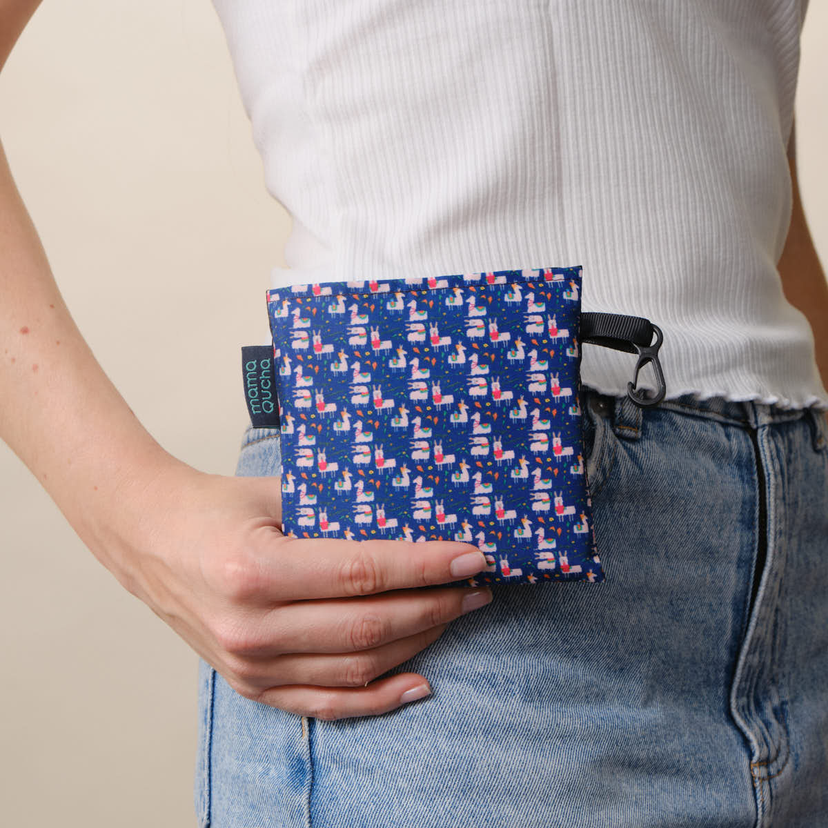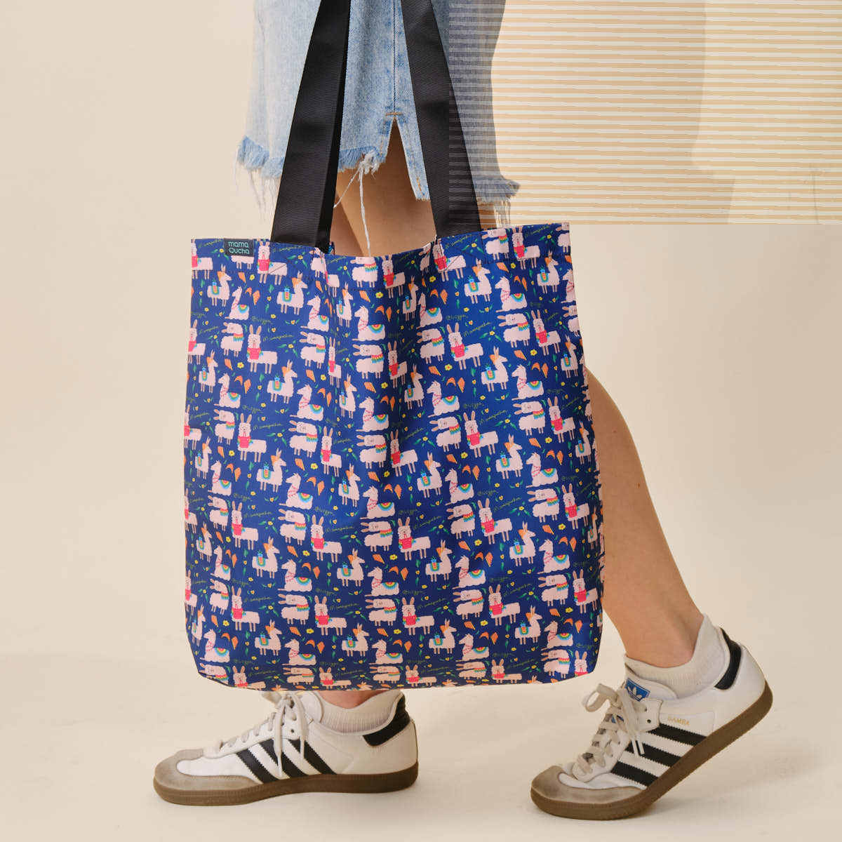 Bolsa de tela plegable: ¡práctica y liviana! Resiste hasta 14 kg de peso sin dañarse. El diseño fue ilustrado por la artista Luz Guzmán (@luzgga_) y retrata llamas peruanas.